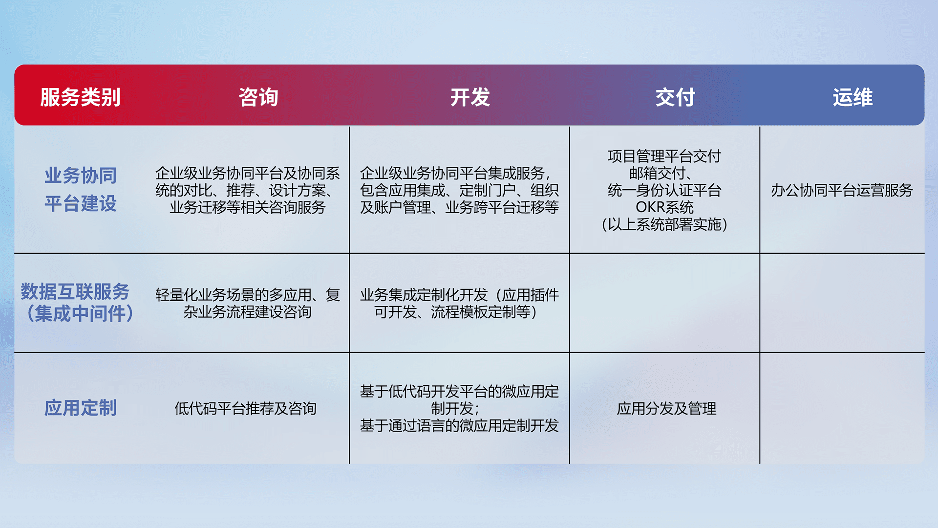 针对钉钉、、企微、、、IDaas等平台级产品提供产品的规划、、方案、、、、交付、、、定制化开发等服务,,,,实现如统一协同办公、、、智能客户服务、、、混合会议管理、、、智能数据查询、、等业务场景,,实现数字化转型。。。。